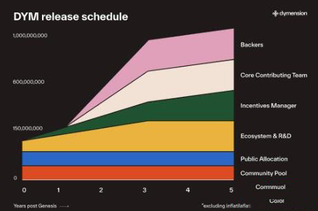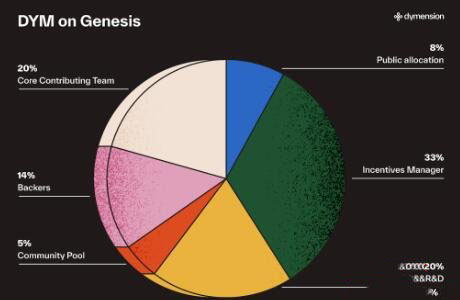 DYM 创世时流通的**数量为1.4667 亿枚。初始流通供应量由公共分配和生态系统和研发基金组成,该基金在启动后立即可用。