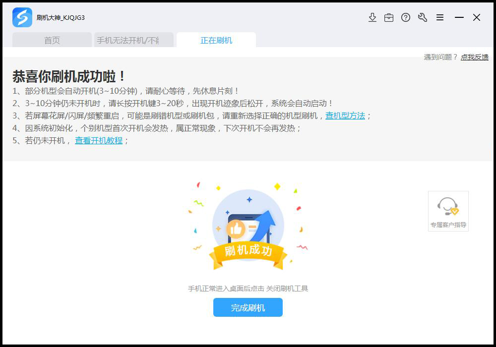 9、刷机成功。刷机过程大约3-5分钟,刷机完成会跳转到刷机成功界面,此时整个刷机过程就顺利完成啦!