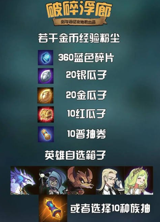 依旧是金/银瓜子、蓝色碎片、红装备箱子、普通单抽券;另外还有自选英雄5选1,或者十个种族券。
