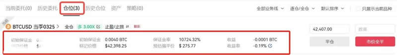 7、挂单成交后,可在持仓界面中可查看订单的相关数据,例如保证金、收益、收益率、预估强平价等。