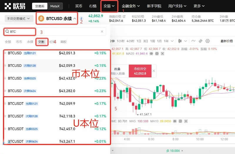 5、在交易页面点击币对右侧的下拉按钮,在搜索框输入币种,在保证金交易处选择交割,选择合约周期为当周、次周、当季或次季的币本位/U本位合约。此处以当季币本位合约为例