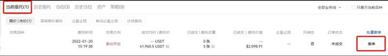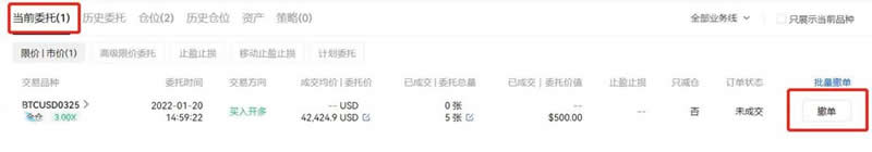 3.设置杠杆倍数,选择账户模式、委托类型,输入价格、数量,点击买入开多(看涨)或卖出开空(看空)。未成交的委托挂单可单击撤单撤销委托。