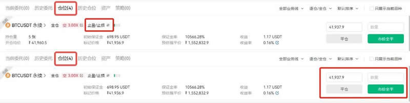 5.您可在持仓界面设置止盈止损,还可选择平仓,输入平仓价格和平仓数量确定平仓,或选择市价全平完成平仓操作。
