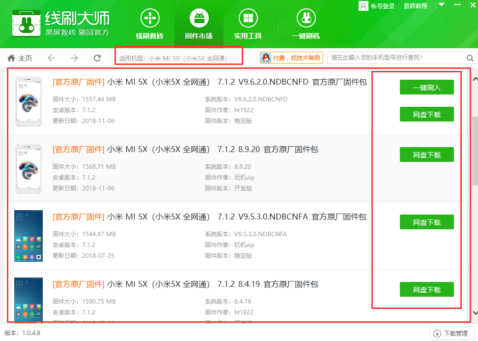 3、也可以在进入固件市场后,通过快速查找机型功能输入“小米”关键词,找到小米5X ,选择小米5X 救砖包点击“一键刷入”。由于小米手机同一型号不同版本之间的线刷救砖包是可以通刷的,所以此时小米5X 用户可以刷入任一救砖包。注意:非此机型请勿刷入,否则手机将**黑屏变砖。