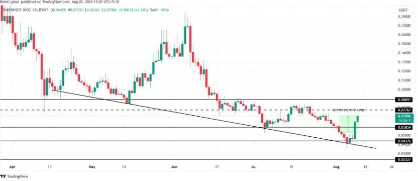 在 TOKEN 持续测试下行趋势线作为支撑后,这有助于山寨币防止进一步下跌。山寨币现在接近突破 0.077 美元的局部阻力位,这可能会进一步推高价格至 0.088 美元。这一阻力位在过去已经受到相当大的测试,突破它将引发上涨趋势。