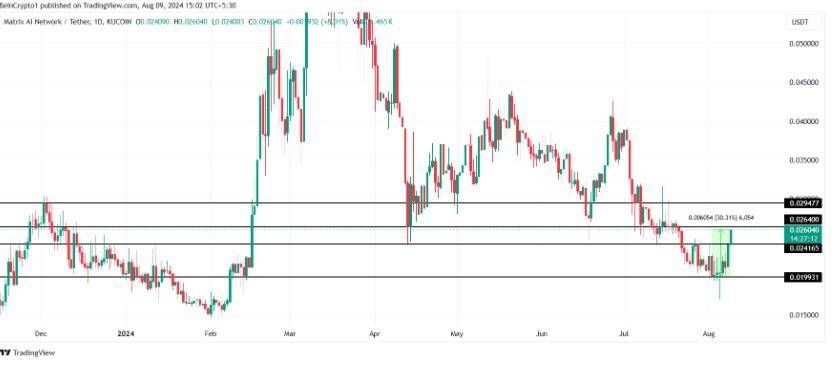 MAN 的增长速度与TOKEN 几乎相同,过去一周上涨了 30% 以上。Matrix AI Network 目前正在测试 0.026 美元的阻力位,这一水平在过去曾起到关键支撑作用。