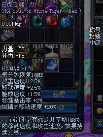 白虎之魂(力)的属性是有2.5%的移动速度和攻击速度增加,还有1.5%的施放速度增加,更重要的是前冲时有8%的几率增加8%的移动速度和攻击速度。这让许多玩家对它趋之如骛,称号的价值已经超越了礼包的价值,在当时是可以卖出2亿金币天价的称号。