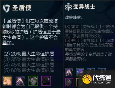 圣盾使提供百分比生命值护盾,如果能拿到转职开5盾,盖伦一个技能就可格挡千伤变成打不死的无赖,有了这样稳固的前排,等到大嘴启动便能收割全场。