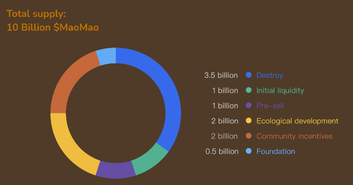MAOMAO**总供应量为100亿 $MaoMao,兑换比例:1 ETH = 3,000,000 $MAOMAO,具体分配如下