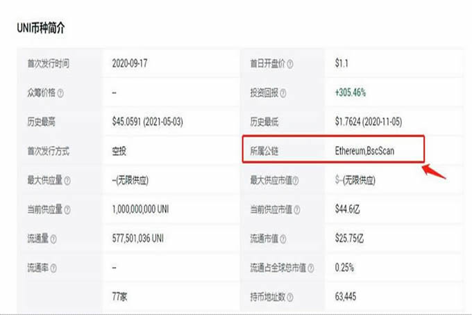 4、我们以热度比较高的Uniswap交易所平台币UNI举例说明,进入UNI币的信息详情页面后,可以看到合约地址为:0x1f9840a85d5aF5bf1D1762F925BDADdC4201F984