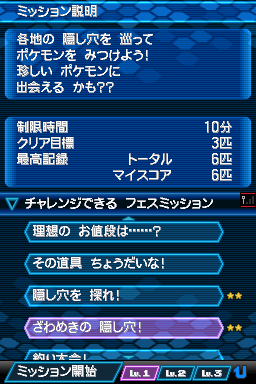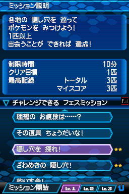 二、嘈杂的隱し穴(B2限定)/安静的隱し穴(W2限定) (10分钟内在隱し穴内遇到3只PM,需要完成上面的任务的Lv1后才出现;Lv2 10分钟内遇5只;Lv3 10分钟内遇10只)