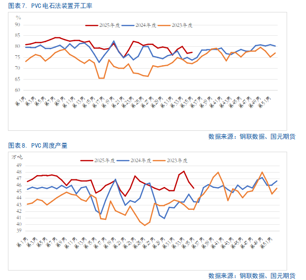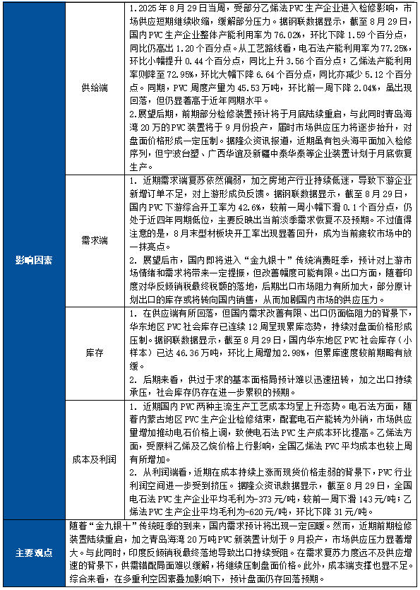 随着“金九银十”传统旺季的到来,**需求预计将出现**回暖。然而,近期前期检修装置陆续重启,加之青岛海湾20万吨PVC新装置计划于9月投产,市场供应压力显著增大。与此同时,印度反倾销税**落地导致出口持续受阻。在需求复苏力度远不及供应增速的背景下,供需错配局面难以缓解,将继续压制盘面价格。此外,成本端支撑也显不足。综合来看,在多重利空因素叠加影响下,预计盘面仍存回落预期。