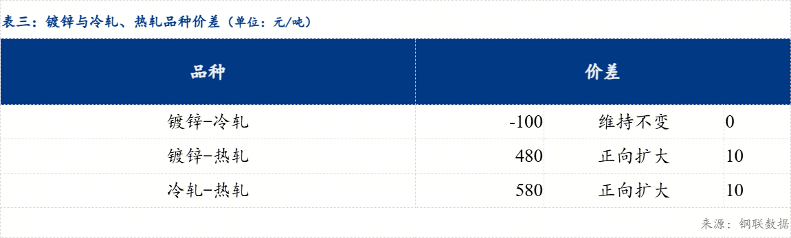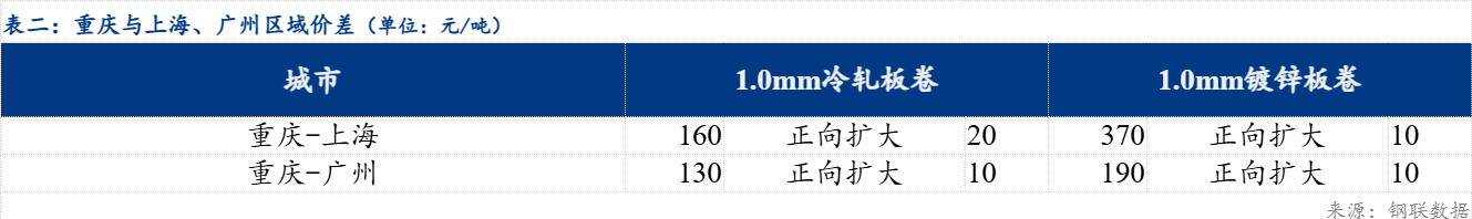 重庆、上海地区冷轧板卷区域价差扩大20元/吨;重庆、广州冷轧板卷区域价差扩大10元/吨。重庆、上海镀锌板卷区域价差扩大10元/吨;重庆、广州镀锌板卷区域价差扩大10元/吨。镀锌、冷轧品种价差维持不变;镀锌、热轧品种价差扩大10元/吨;冷轧、热轧品种价差扩大10元/吨。