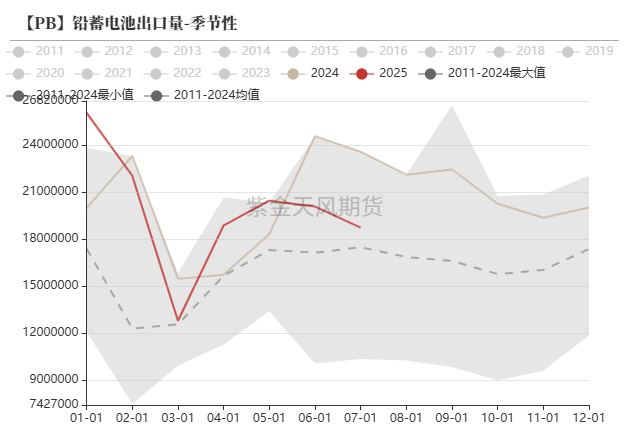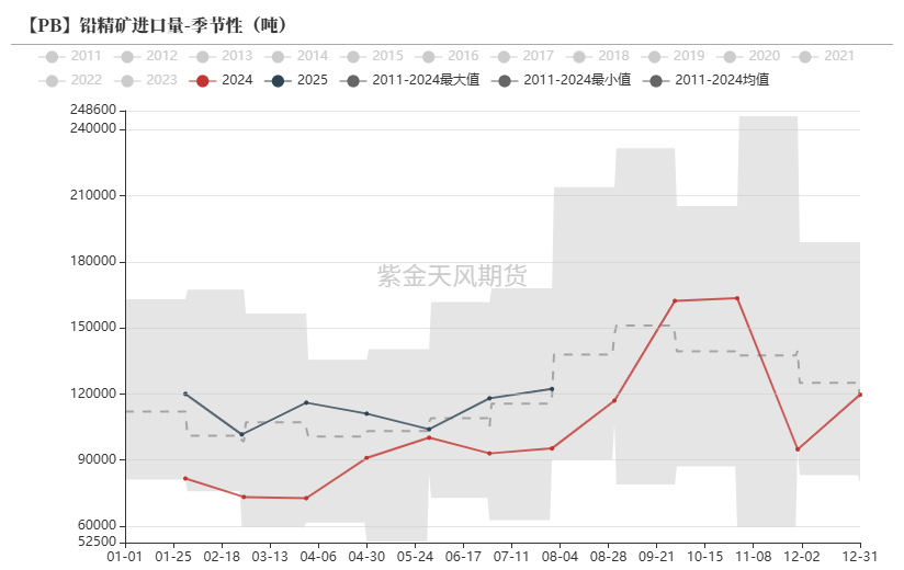 2025年7月铅精矿进口量12.22万实物吨,同比增幅28.4%,1-7月累计进口量为79.30万实物吨,同比增幅30.7%;