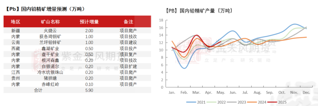 今年**铅精矿产量显著增长。1-5月累计产量达58.06万金属吨,同比增速16.4%,增长主要来自新投产项目的产能释放。