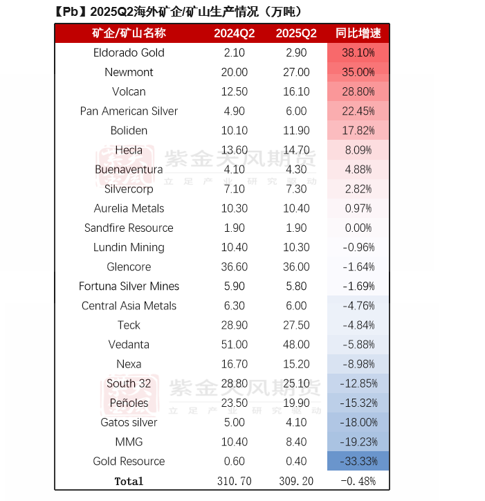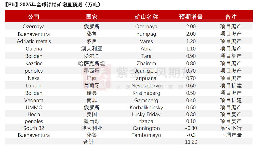 2025年**新增投产项目在俄罗斯Ozernaya、秘鲁的Yumpag、波黑的Vares和澳大利亚的Abra,预计以上4座矿山贡献全年铅精矿增量的60%。
