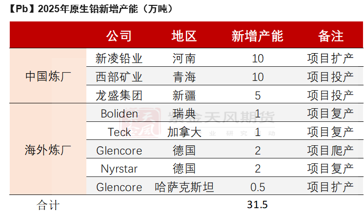 2025年,**仍有新增冶炼项目投产,如新凌铅业、西部矿业、龙盛集团旗下炼厂均有新项目投产扩产,预计**新增产能在25万吨;