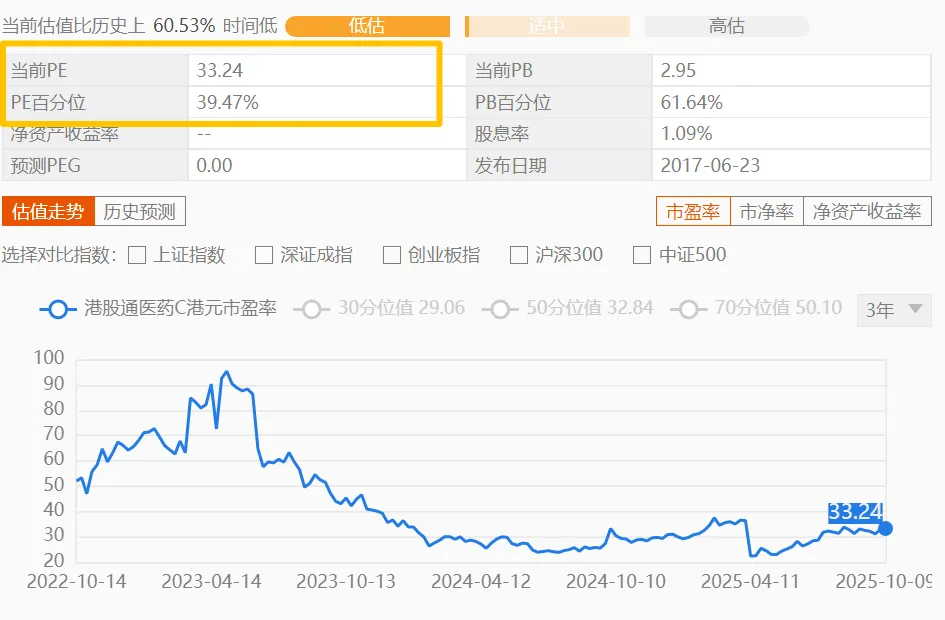港股通医药指数近3年 PE 33.24倍,处历史中位偏低水平