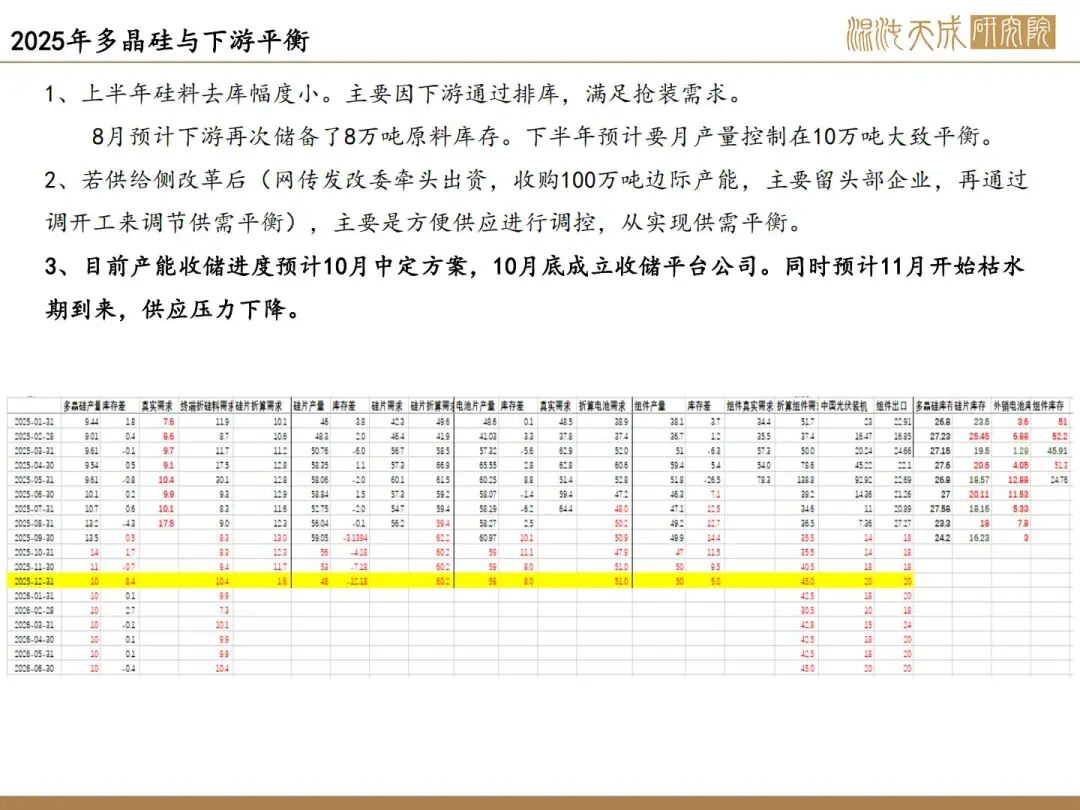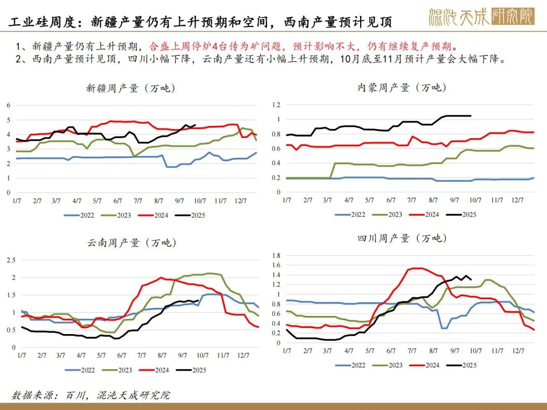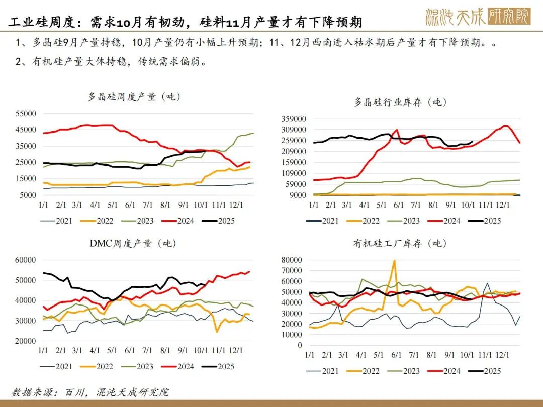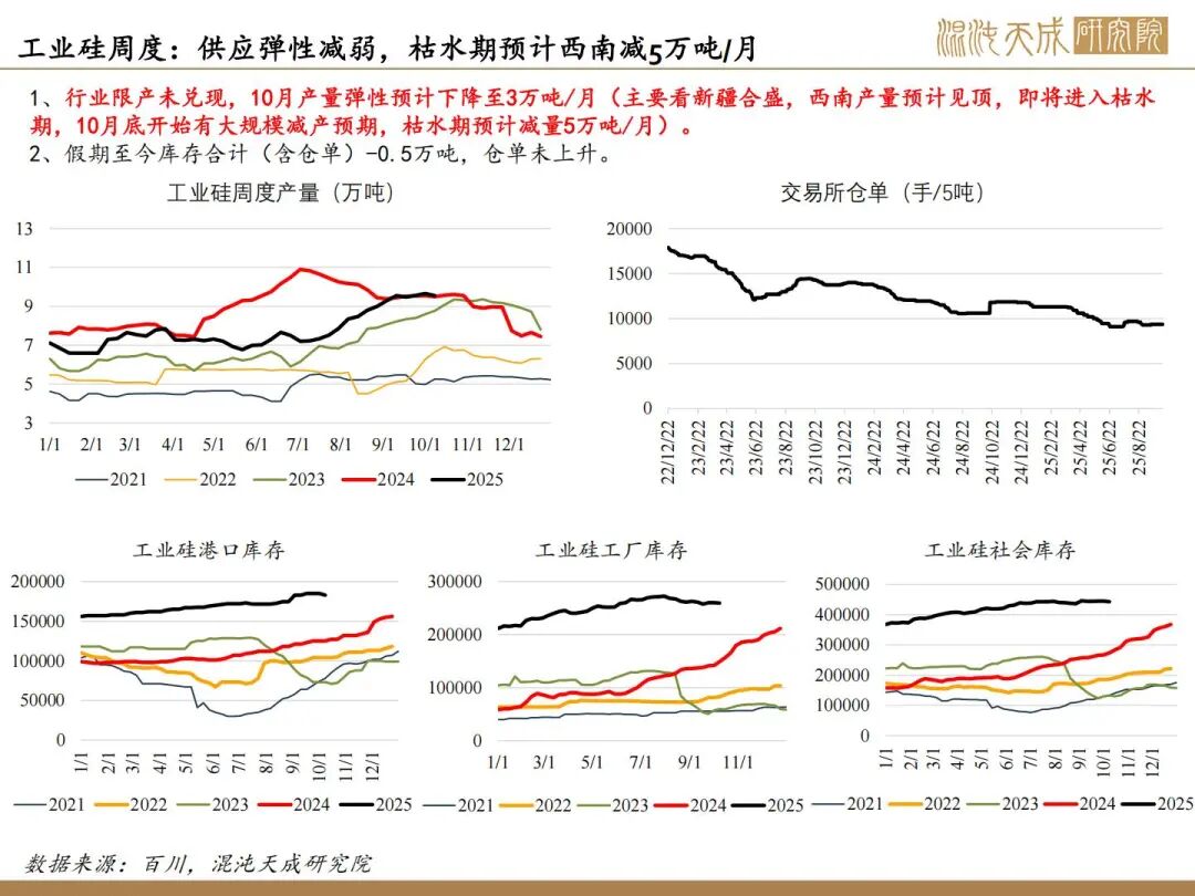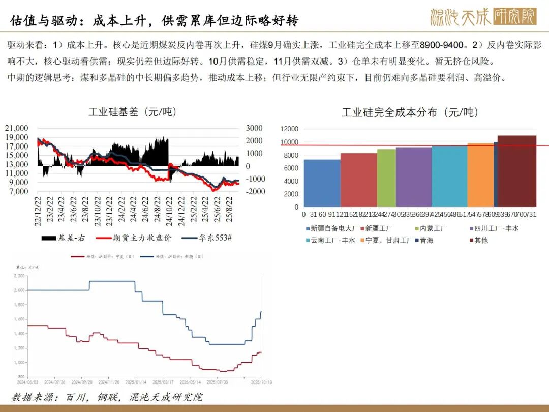 1、反内卷实际影响不大,核心驱动看供需;10月供增需稳,11月供需双弱。目前看因西南将入枯水期,供应弹性下降,核心关注合盛复产情况,若合盛继续复产,累库压力持续上升,若保持当前开工,预计大致平衡。