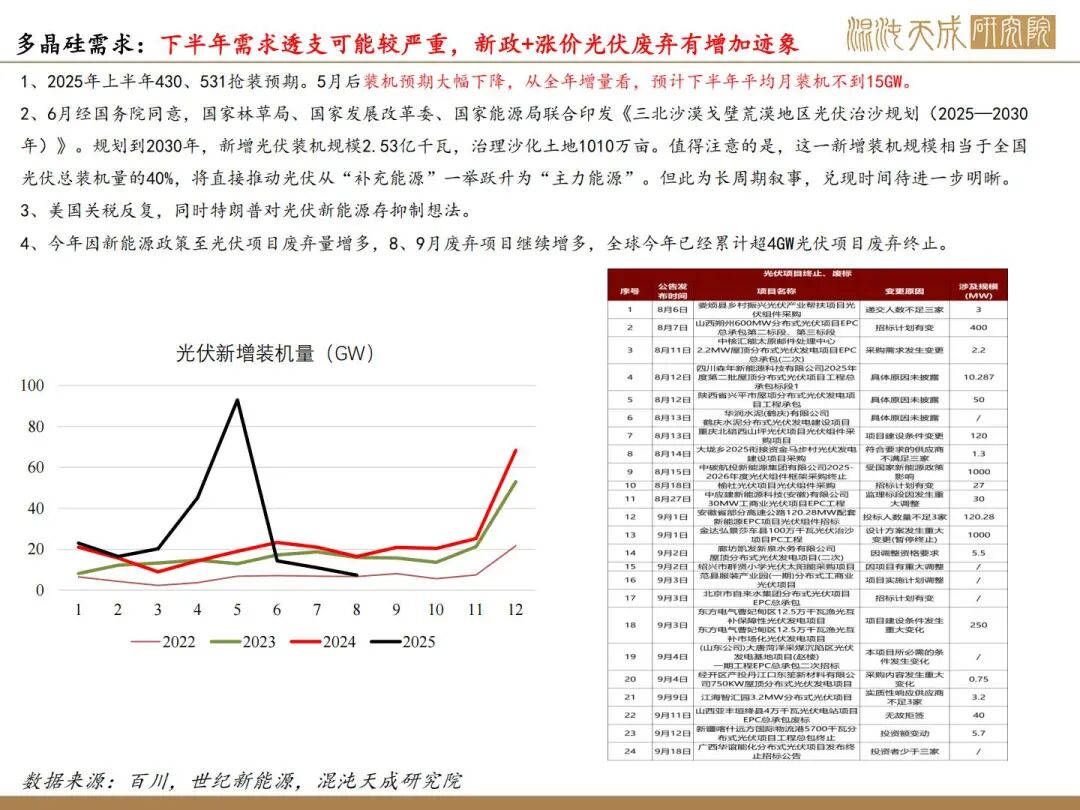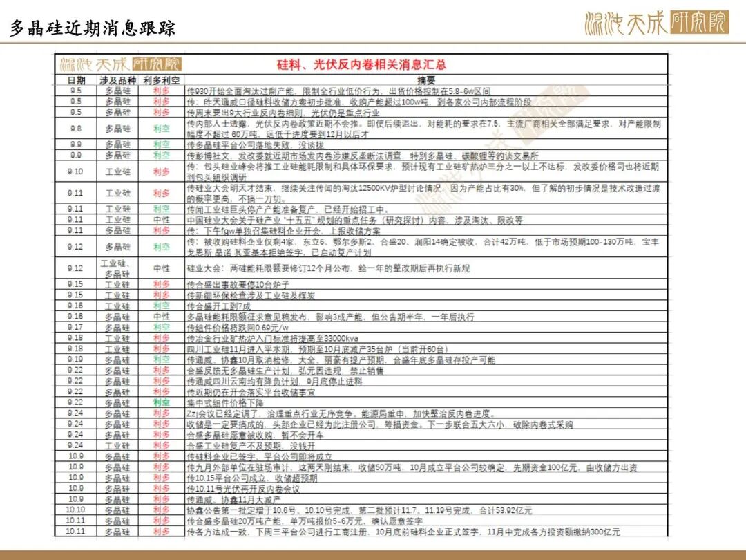 1、反内卷驱动,收储预计延期至10月。周末传各个达成一致,下周三平台公司进行工商注册,10月底前硅料企业正式签字,11月中完成各方投资额缴纳300亿元。