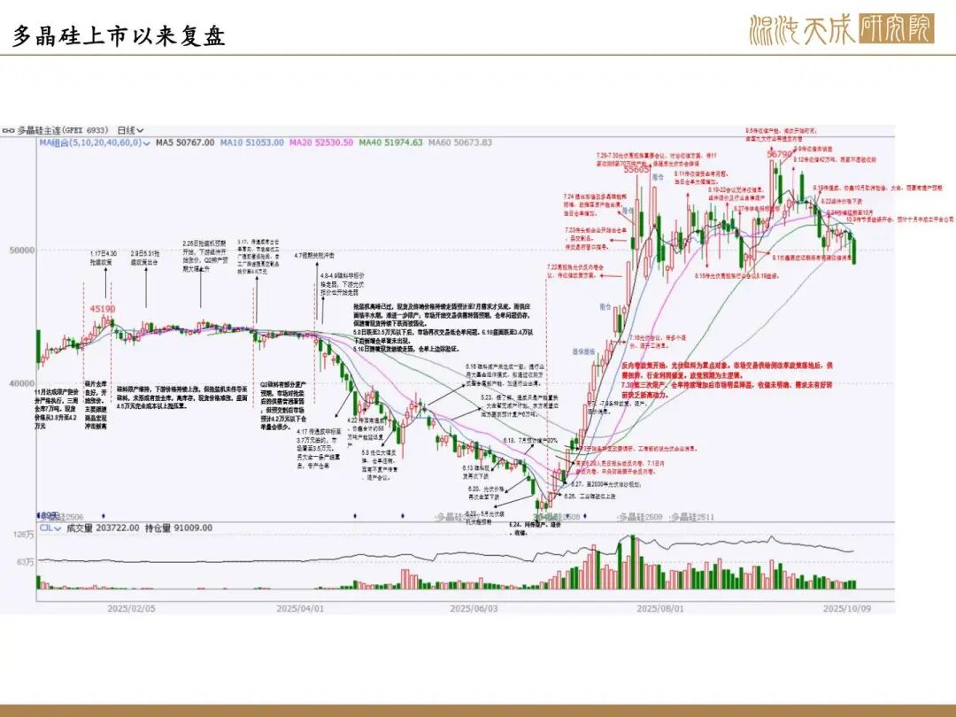 结论:下跌主因收储不明确,现实供需压力上升。但考虑硅料有明确收储预期,反内卷仍是中期交易主线,远月结构上仍看多。10月若收储继续推进,远月仍有冲高动力;若收储继续延期,盘面仍会面临持续回调,11月合约关注4.9万附近支撑,12月及以后合约关注5.1万元附近支撑,但11月西南电价抬升,供应压力不大预计支撑较强。