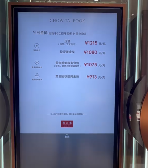 10月14日中午,广州一周大福门店价格显示,足金饰品零售克价为1215元,投资类黄金克价1080元,黄金回收克价913元;