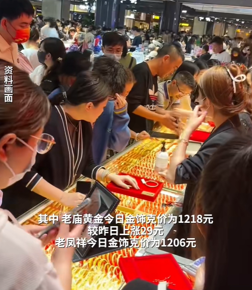 同一天,老庙黄金足金饰品克价调整为1218元,比前一日上涨29元;老凤祥足金饰品克价为1206元,比前一日上涨24元;周生生今日金饰克价为1213元,六福珠宝今日金饰克价为1215元。