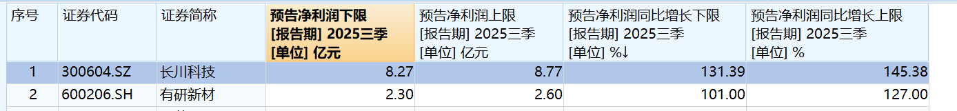 国泰海通证券指出,2025年公司CIS测试机、存储测试机陆续进入放量周期,预计2025年全年长川科技的归母净利润将超市场预期。有研新材前三季度归母净利润同样大增101%-127%。