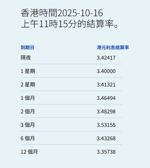 10月16日,港元拆息普遍向上,隔夜息报3.42417%,升7.941基点;一周拆息升2.768基点,报3.4%,两周则跌0.108基点,报3.41321%。与楼按相关的一个月拆息报3.46494%,升4.077基点。
