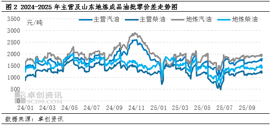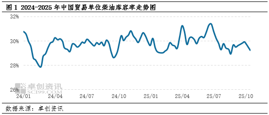 国庆假期期间,原油价格震荡为主,整体波动有限,趋势并不明显,但是市场对沙特增产表示担忧,**偏空;假期归来之后,加沙地区和平协议迅速达成,地缘溢价回吐,油价继续承压;而近期美国贸易关税问题再度发酵,宏观环境恶化,油价延续下行趋势。因此,从国庆至今,在沙特增产、中东和平和美国贸易问题的背景下,原油价格整体呈现弱势行情。受此影响,**成品油零售限价调整在10月13日经历下调后,新周期的原油变化率负值开局且不断加深,目前对应的零售价下调幅度已超300元/吨,市场看空情绪极为浓厚。此外,国庆假期至今,**部分地区尤其是北方地区持续降雨、东北个别地区已经遭遇降雪,导致户外工程开工率偏低,柴油需求持续**。因此,10月上旬贸易单位补货意愿极为低迷,多消化库存为主,柴油库容率环比上月底下降明显。