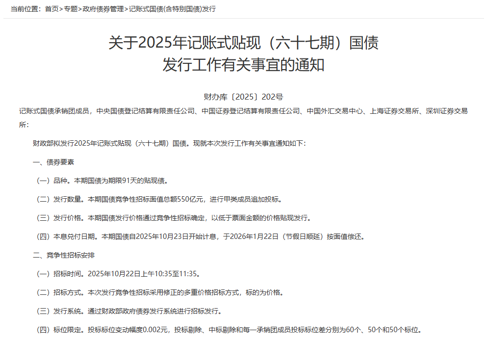 10月21日,财政部发布通知称,拟发行2025年记账式贴现(六十七期)国债。本期国债为期限91天的贴现债。本期国债竞争性招标面值总额550亿元,进行甲类成员追加投标。