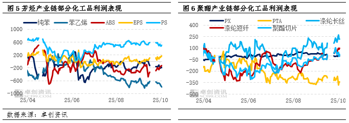 芳烃产业链利润整体仍处承压区间,但环比有所改善。上游环节中,纯苯和苯乙烯价格持续承压,周跌幅分别为3.42%和4.07%,月跌幅达8.7%和9.03%;苯乙烯非一体化装置理论利润从9月的深度亏损-800元/吨附近修复至-700元/吨左右,亏损幅度收窄但**水平仍处高位。下游制品端盈利改善,ABS价格周跌3.49%、月跌5.88%,利润从-300元/吨修复至-200元/吨;EPS价格周跌2.14%、月跌5.65%,毛利逆转为盈利175元/吨。聚酯产业链下游利润改善,上游受制于基本面修复动力不足。上游PX利润波动较小,在盈亏平衡线附近徘徊,PTA毛利维持在150-200元/吨区间,虽原料PX下行提供成本支撑,但行业开工率高企及新增产能投放导致供应过剩,压制利润修复;下游涤纶长丝、涤纶短纤和聚酯切片周均毛利扭亏为盈,分别达到215元/吨、70元/吨和41元/吨。