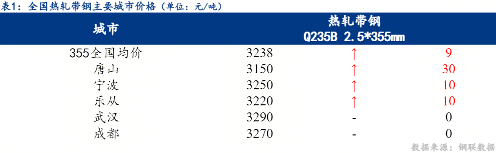 22日热轧带钢**主要城市价格主涨个稳,截至发稿时2.5*355mm热轧带钢均价3238元/吨,较昨涨9元/吨,其中2.5*355mm主要城市报价为唐山3150元/吨,宁波3250元/吨,乐从3220元/吨。