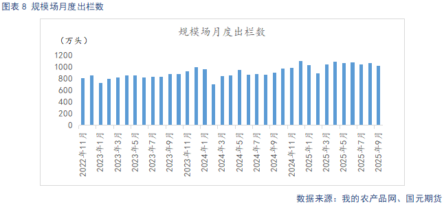 据Mysteel统计,截至2025年9月底,样本规模场能繁母猪存栏量为504.21万头,环比下降0.28%,同比增长1.09%。8-9月传统需求旺季,猪价却持续低迷,加之政策引导下的产能调控,规模场开始优化产能,低效母猪淘汰加速,规模场能繁母猪存栏开始小幅下降。但从生产周期推算,2025年规模场理论产能仍呈现环比上升态势,产能调控若顺利推进,实际兑现效果也要等到26年二季度后,后续也要持续观察产能调控的持续性。样本规模场9月商品猪存栏数为3684.99万头,环比增加1.44%,同比增加5.29%。样本规模场9月商品猪出栏量为1021.73万头,环比减少4.54%,同比增加23.49%。9月中小散认卖意愿较强,市场猪源充足,加之需求提振力度有限,部分规模场出栏计划未能完成。10月上旬,规模场加速出栏,供给集中释放,猪价持续低迷。至10月下旬,挺价情绪升温,出栏节奏放缓。供给过剩情况未根本性扭转,而压栏导致部分供给后置,近期猪价回暖后,养殖端认卖情绪升温,二育因补栏成本增大,入场积极性下降,出栏节奏逐步恢复,供给延续宽松预期。