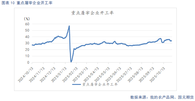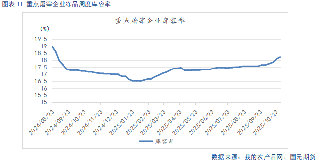 截至11月4日,**屠宰企业开工率为33.53%,较上周环比下降0.7%。冷冻肉库容率18.21%,较上周环比持平。随着居民、餐饮的节前储备逐步消耗,气温转凉后,居民肉类消费有所回升。不过在腌腊、年底备货集中开启前,需求增量有限。近期猪价反弹后,终端走货开始放缓,屠企购猪意愿下降,开工率小幅回落,显示出需求整体仍显低迷。冻库库存方面,冻肉走货**,且猪价仍处低位,存在被动入库的现象,冻品去库**。需要注意的是,猪价低迷时,屠企低价分割入库,**程度上缓解市场供应压力,在下方支撑猪价。但猪价回暖,低价冻品投放市场,将对鲜肉消费造成**冲击,抑制猪价上方空间。