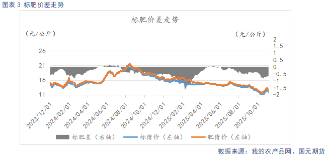 从能繁母猪存栏变化趋势推算,四季度生猪市场理论供给量仍将保持高位。临近年末,规模场为达成年度出栏目标,面临较大的出栏压力。而10月中下旬的压栏、二育操作导致供给后置,进一步加剧了年底的供应压力,目前养殖端出栏节奏已逐步加快,短期市场供给趋向宽松。而需求端尚未进入集中启动阶段,仍处于**复苏状态,供强需弱的格局延续。不过从盘面上看,此前期现走势呈现分化态势,盘面相较于现货表现偏弱,已提前兑现了对后期潜在供应压力的预期。因此,在当前现货价格反弹受阻的背景下,期货盘面下方空间相对有限,预计短期将以低位震荡运行为主。生猪2601参考区间11500-12500元/吨。