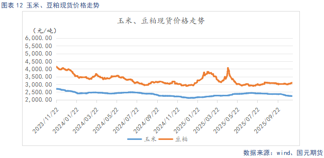 截至11月4日,玉米现货均价2234.31元/吨,较上周环比下跌6.57元/吨,豆粕现货均价3049.14元/吨,较上周环比上涨48元/吨,玉米延续小幅下行,豆粕小幅回升。玉米从东北产区粮食上市量持续增加,但直属库及贸易商积极开展建库操作,有效支撑现货价格企稳运行。华北地区因本地粮食品质不佳,市场对东北粮食的抢购需求升温,带动当地粮价低位反弹。未来一周,东北地区将遭遇雨雪天气,当前粮食丰产的既定现实与天气带来的不确定性相互交织,短期价格窄幅波动。 豆粕从基本面看,海关数据显示,10月**大豆进口量将开始逐步回落,不过豆粕库存仍会维持在阶段性高位。接下来需要**关注四季度**下游饲料企业的采购节奏,如果养殖端对豆粕的需求没有出现明显增长,豆粕库存会延续累积的趋势,市场面临的去库存压力依然存在。