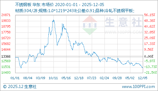 据生意社价格监测,本周不锈钢价格小幅上涨。截止12月5日,现货304/2B不锈钢平板1.0*1219*2438(公差0.91)的日均价为现报价11491.67元/吨,较周初上涨0.44%,同比下跌6.63%。
